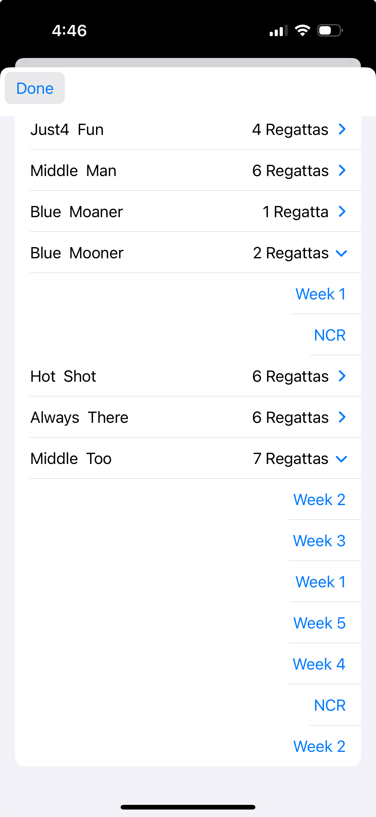 Scanning the list will make it easy to see skippers who were entered under different names such as "Blue Mooner" and "Blue Moaner" here. Tapping the incorrect skipper name will show which regatta the error was made in, and tapping the regattas Tab, then that regatta, and then the skippers tab will allow editing of the name. The competitors list will update automatically when it is next shown.